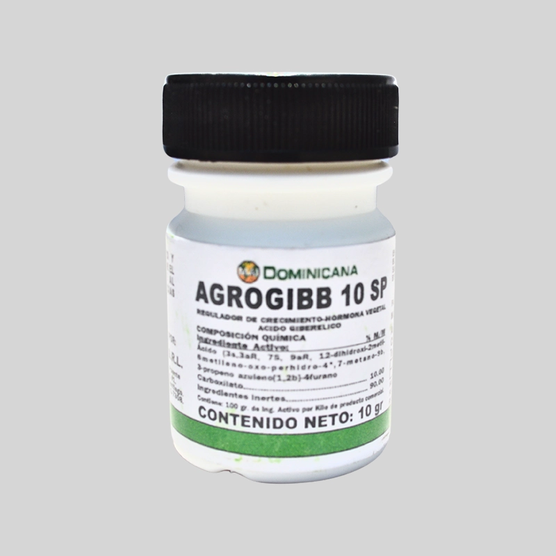 AGROGIBB 10 SP, es un Fitoregulador de crecimiento de acción hormonal que estimula y regula el desarrollo de las plantas. La respuesta fisiológica de los vegetales tratados dependerá del estado de desarrollo en que se encuentran. La formulación es en polvo soluble, 100 g de ingrediente activo por kg. El GA3 tiene efecto en la actividad de elongación celular, estimula la elongación vegetativa, induce el desarrollo de flores, aumenta el tamaño del fruto, rompe la latencia en semillas y inhibe la senescencia de frutas, extendiendo la vida útil comercial de la fruta durante el transporte a los mercados internacionales.